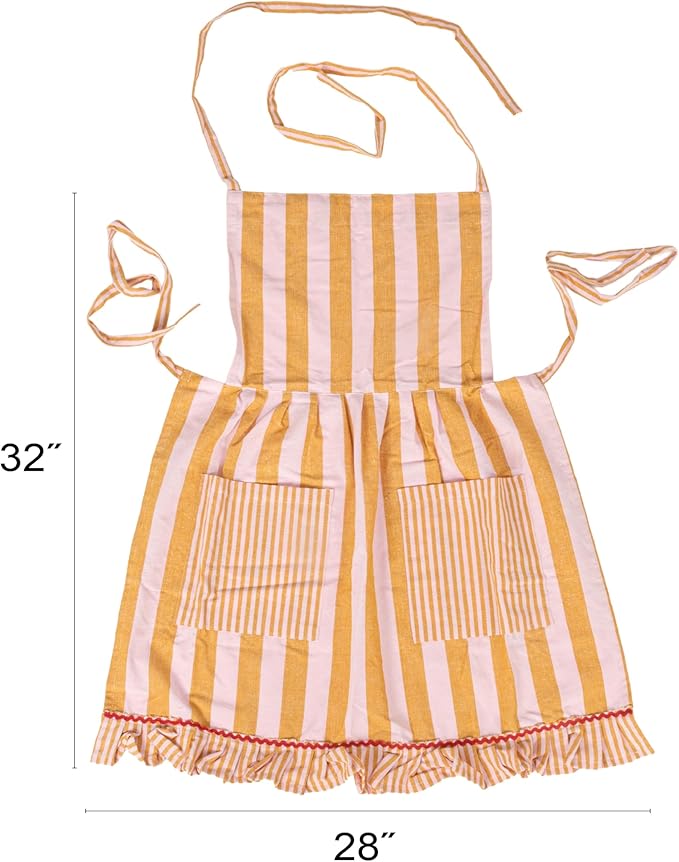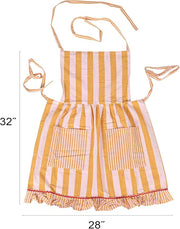 • A playful woven cotton striped apron featuring a ruffle, two front pockets, and a ric rac trim in a vibrant mustard, pink, and red color palette